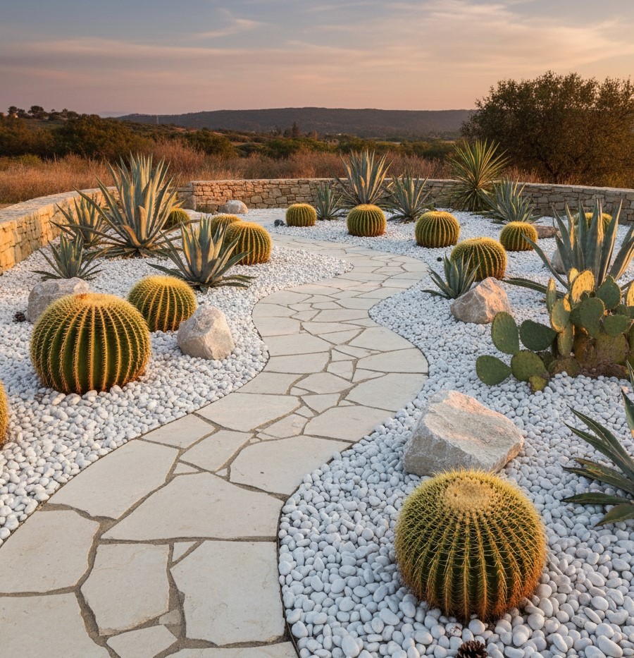Menempatkan batu sikat putih di sekitar tanaman seperti kaktus, lidah mertua, agave, atau euphorbia memberikan kesan lebih terorganisir. Area tanam terlihat rapi dan setiap elemen tanaman tampil lebih menonjol.