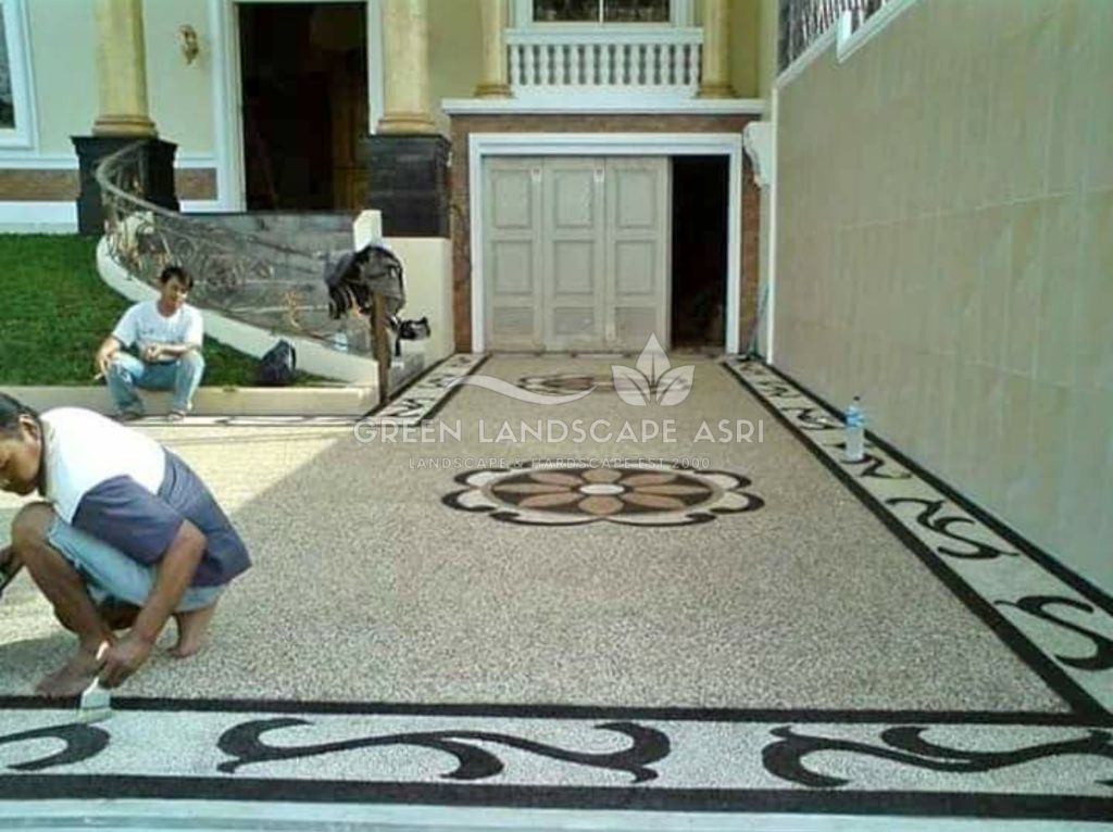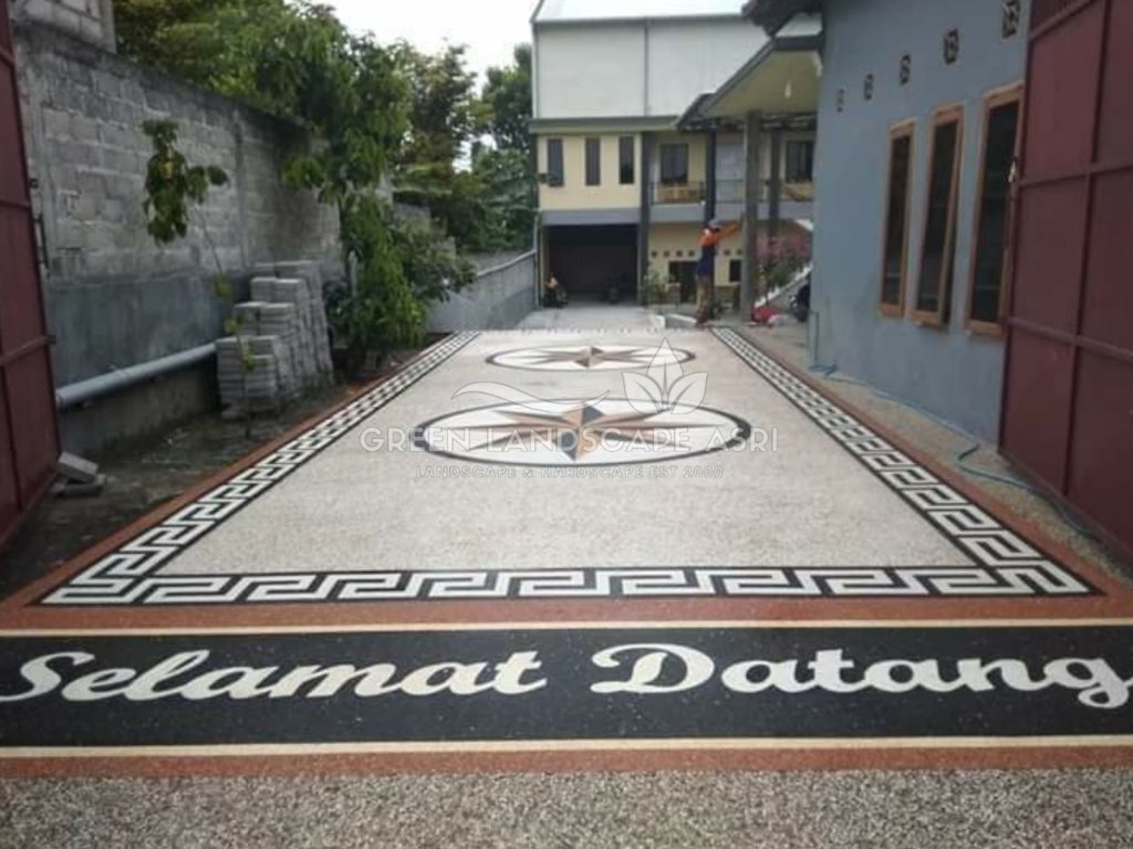 | Paket Eksklusif | 30 m² ke atas | Motif custom/inisial/logo | Rp 200.000–250.000/m² | Coating + pot tanaman dekoratif |