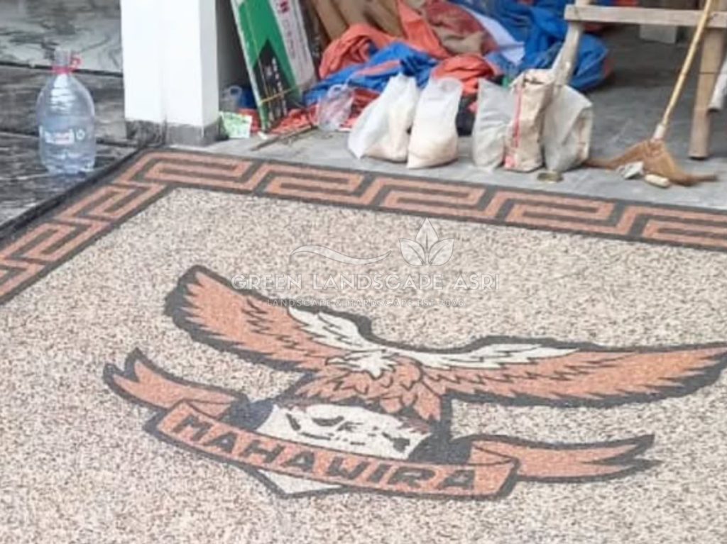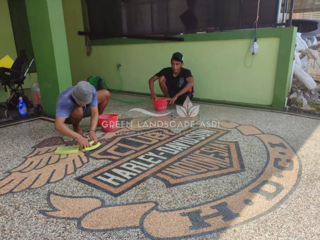 | Paket Eksklusif | 30 m² ke atas | Motif custom/inisial/logo | Rp 200.000–250.000/m² | Coating + pot tanaman dekoratif |