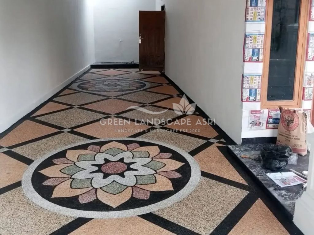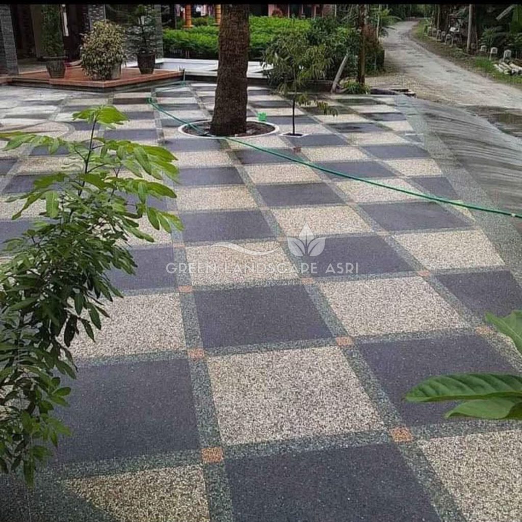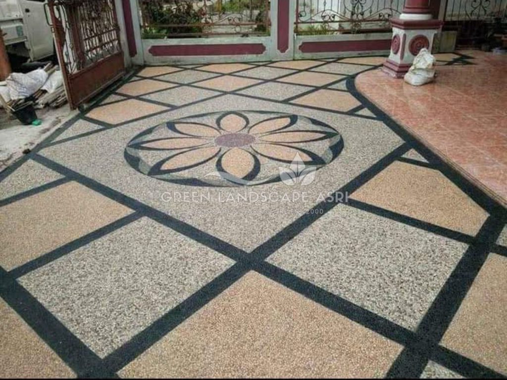 | Paket Eksklusif | 30 m² ke atas | Motif custom/inisial/logo | Rp 200.000–250.000/m² | Coating + pot tanaman dekoratif |