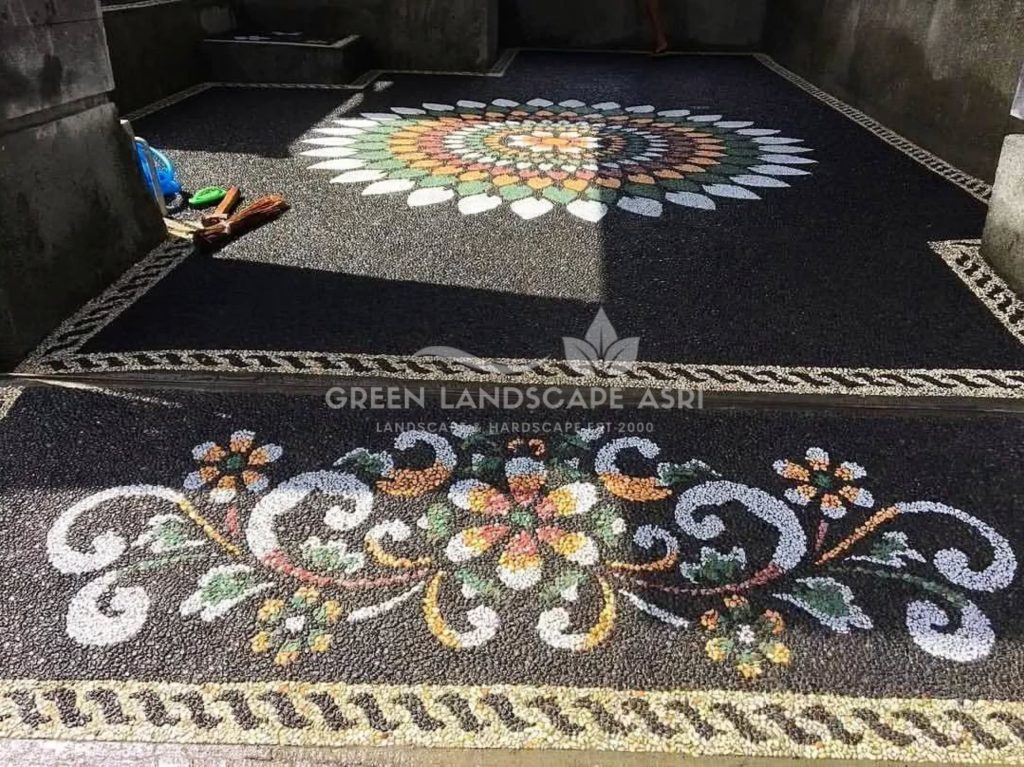 - Taman atau Jalur Setapak: Gunakan motif alami atau spiral agar menyatu dengan elemen hijau. Kombinasi warna cerah membuat area ini terasa lebih hidup.